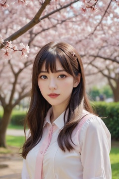 one pretty girl, solo, supermodel, pale skin, long wavy hair, blunt bangs, make up, parted lips, big tits, school uniform, white shirt, pleated skirt, looking at viewer, a blooming cherry blossom grove, with delicate pink petals floating in the breeze, soft lighting, film grain, upper body
