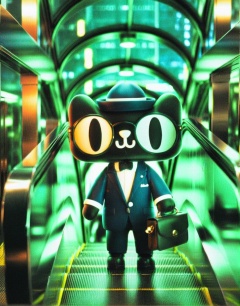 masterpiece, best quality,Tmall,Tmall ip,Rich details, C4D modeling, octane render,Standing on the escalator, wearing black round glasses, wearing a black suit and trousers, holding a black leather bag, a black hat, black shoes, a glass roof, <lora:Tmall SDXL-000006:0.8>, masterpiece, best quality,