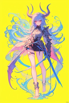 A girl, full body photo, pink hair, blue hair, pink eyes, light blue background, yellow background, armor, horns,Long legs, barefoot,