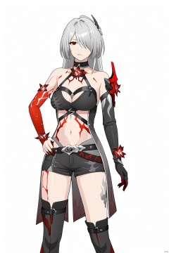 score_9,score_8_up,score_7_up,best quality,masterpiece,source_anime,8k,best quality,masterpiece,(ultra-detailed),(high detailed skin),(full body),white background,standing,looking at viewer,(solo),hand on hip,whuangquan, white hair, asymmetrical clothes, 1girl, breasts, long hair, red eyes, hair over one eye,navel,bangs,cleavage,bloody hand,single glove,(left single sleeve),long_sleeve,grey pic,(white background, simple background),,full_shot<lora:EMS-333557-EMS:0.800000>