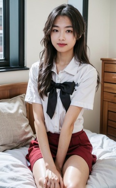 solo,pantyhose,school uniform,skirt,red skirt,sitting,long hair,window,1girl,serafuku,bow,short sleeves,indoors,sailor collar,red skirt,bangs,bowtie,shirt,looking at viewer,cosplay,white shirt,red bow,grey hair,smile,black pantyhose,on bed,pleated skirt,black hair,own hands together,feet out of frame,<lora:TUIBUXIJIE:lbw=INS>,sitting sideways,expressionless,