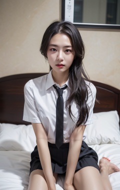 1girl,black pleated skirt,white shirt,necktie,outdoors,hands on wait,white legwear,very sexy,lying on the bed,<lora:腿:0.7,,