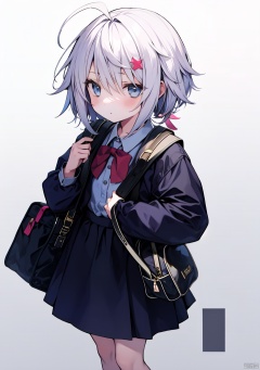 1girl, ahoge, bag, basket, dress, hair_ornament, looking_at_viewer, schoolbag, skirt,white_hair, girl