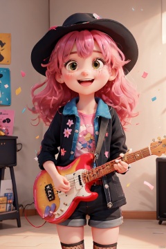 1girl, bangs, bass_guitar, belt, black_hair, black_jacket, black_shorts, blurry, blurry_background, breasts, cherry_blossoms, concert, confetti, electric_guitar, fishnet_legwear, fishnets, garter_straps, guitar, hat, holding, holding_instrument, instrument, jacket, long_hair, microphone, microphone_stand, multicolored_hair, music, open_clothes, open_jacket, open_mouth, petals, playing_instrument, plectrum, red_hair, blue_hair,pink_hairshirt, shorts, smile, solo, spotlight, stage,streaked_hair,thighhighs,迪士尼