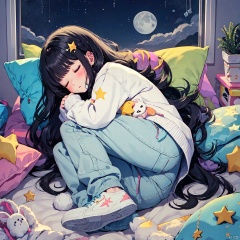 1girl, solo, long hair, blush, bangs, black hair, hair ornament, long sleeves, very long hair, closed mouth, full body, closed eyes, lying, shoes, pants, indoors, star \(symbol\), sweater, pillow, bed, on bed, on side, moon, white footwear, sleeping, star \(sky\)