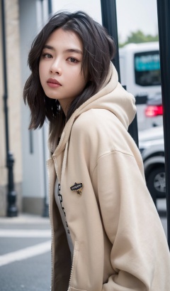 1girl,hood,solo,hooded_jacket,white_hoodie,blurry,textured skin,With a coat over a hoodie,aloof,cold tone,perfect eyes,(soft lighting),Porta 160 color,shot on Leica T,bokeh,sharp focus on subject,shot by Candida Höfer,Outstanding,Best Quality,Detailed,Eyes,Normal Human Eyes,Facial Features,Asian Female,Pale Skin,Cold,Medium Length Hair,Black Hair,Eyes and Face to the Viewer,Side View,Standing,Messy Hair,Hair Detailed,Wearing White Hoodie Inside,Khaki Coat Outside,Winter,Simple Background,Cloudy Day,City Background,Urban,Cold Expression,Sparkling Eyes,Smooth Skin,Beauty Paramount,