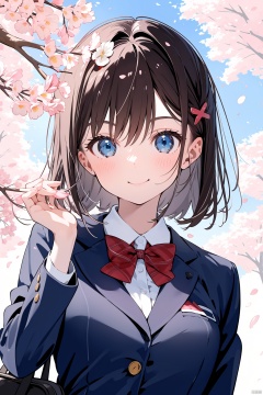 1girl, solo, blue eyes, smile, jacket, bow, school uniform, shirt, looking at viewer, upper body, collared shirt, brown hair, white shirt, cherry blossoms, bangs, blazer, long sleeves, blush, bowtie, red bow, closed mouth, black jacket, outdoors, breasts, hair ornament, medium hair, bag, red bowtie, pink flower, hair between eyes, medium breasts, flower, hands up