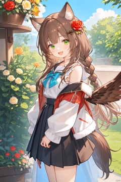 best quality, amazing quality, very aesthetic,1girl, solo, flower, skirt, bouquet, rose, animal_ears, pleated_skirt, smile, tail, virtual_youtuber, looking_at_viewer, yellow_flower, green_eyes, shirt, white_flower, off_shoulder, holding, long_sleeves, jacket, bangs, holding_bouquet, :d, multicolored_hair, outdoors, white_shirt, brown_hair, hair_ornament, white_rose, looking_to_the_side, hair_flower, sky, puffy_long_sleeves, black_skirt, orange_flower, day, puffy_sleeves, fur_trim, sailor_collar, blue_sky, yellow_rose, brown_skirt, braid, open_mouth, brown_flower, animal_ear_fluff, wide_sleeves, red_flower, brown_jacket, white_hair, fur-trimmed_sleeves, standing, wings, red_rose