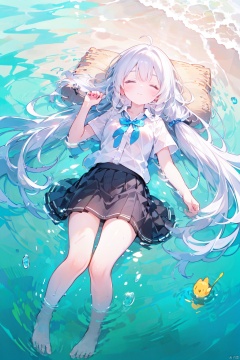 best illustration,(colorful),(from above:1.4),((close up)),(1girl:1.2),(lying_on_water:1.2),(floating on water),full body,(beautiful and delicate face),(beautiful long white hair),(very long white hair),closed eyes,small breasts,(black pleated skirt:1.25), (facing up), water background,(reflective water surface),(flouds in water :1.4),(clouds in water),water with feathers, masterpiece, 1girl,((white hair)),(collared shirt),(white stocking),solo,collarbone,slim legs,(hand on own chest), (water background:1.2),