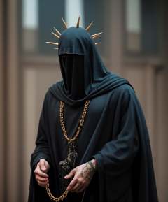 solo,1boy,upper body,male focus,blurry,no humans,chain,spike,cloak,hood up,robe,blurry background,<lora:cultiste-07:1>,