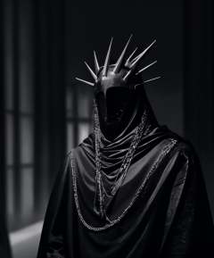 dark theme,solo,1boy,upper body,male focus,blurry,no humans,chain,spike,helmet,cloak,hood up,robe,blurry background,<lora:cultiste-07:1>,<lora:LowRA:0.8>,