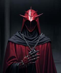 red theme,dark theme,1boy,male focus,blurry,no humans,chain,spike,helmet,holding dagger,cloak,hood up,robe,upper body,solo,<lora:cultiste-07:0.8>,<lora:LowRA:0.8>,