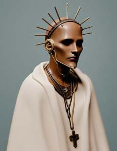 Steampunk style score_9_up,score_8_up,score_7_up,score_6_up,dark,chiaroscuro,low-key,(faceless:1.2),solo,hood,hood up,covered face,robe,shoulder armor,chain,male focus,upper body,necklace,cross,<lora:cultistexl-000005:1>,<lora:zavy-cntrst-sdxl:0.8>,<lora:xl_more_art-full_v1:0.8>, . Antique, mechanical, brass and copper tones, gears, intricate, detailed