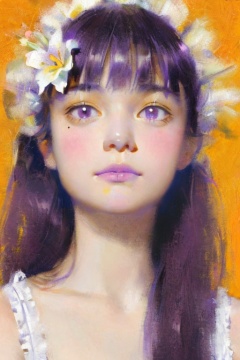 Portrait front,1girl,masterpiece,highest quality,high quality,realistic photo,(coupy pencil:0.3),brush strokes,oil painting,masterpiece,highest quality,high quality,cute,wallpaper,concept artflower,rim light,blurry and many light particles,Movie Lighting,colorful,looking at viewer,upper body,mole,eyelashes,fashion photography,soft focus,eclectic,depth of field,close up,face focus,simple background,yellow background,1girl,solo,flower,hair ornament,long hair,purple hair,upper body,looking at viewer,sleeveless,white flower,bangs,multicolored eyes,yellow background,shirt,closed mouth,purple eyes,smile,white shirt,sleeveless shirt,frills,hair flower,bare shoulders,breasts,blunt bangs,frilled shirt,hairclip,lily (flower),crescent,