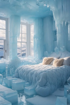 A room encased in ice, with bed surrounded by glacial blocks, from roof to floor everything is laced with frost. The walls and table are frozen over, and the snowy landscape is visible beyond the window, dramatically lit by theatrical lighting that blends bright illumination harmoniously with nature's icy touch.