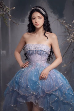 1 girl,Bare shoulders,barefooted,Blue dress,dress,pantyhose,Rhinestones,Strapless dress,solo,<lora:精灵舞裙0407-000004:0.8>,long hair,