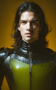 art by Tim Walker, 3D Rendering, Elite buff Male Dragon slayer, Dark hair, inside of a Highway, Fine art, Satisfying, (Yellow theme:0.7) , Black lighting, Selective focus, glimmering transformation,