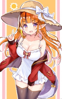 Thin lines, 1girl, breasts, solo, horn bow, kiryu coco, bow, tail, hat, dragon horns, diagonal-striped bow, dragon tail, dragon girl, virtual youtuber, orange hair, thighhighs, long hair, cleavage, horns, large breasts, horn ornament, pointy ears, blonde hair, looking at viewer, bangs, multicolored eyes, skin fang, jewelry, white camisole, black thighhighs, open mouth, fang, striped bow, braid, sun hat, red eyes, smile, multicolored hair, striped, blunt bangs, camisole, jacket, straw hat, frills, blush, streaked hair, single braid, bare shoulders, partially unzipped, spaghetti strap, red jacket, cowboy shot, collarbone, sidelocks, white bow, purple eyes