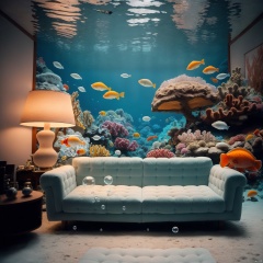 A room with a blue sofa and a chair, both decorated comfortably and elegantly. Next to them, there is a transparent bubble filled with a beautiful underwater world. You can see colorful fish swimming freely and several jellyfish twinkling faintly. In the center of the scene, there is a pillow printed with a seascape pattern. The whole picture is filled with a peaceful and harmonious atmosphere. A high-definition, high-quality image featuring an indoor scene with a blue theme, underwater, bubbles, jellyfish, fish, and a pillow with a scenic print.<lora:EMS-333180-EMS:0.800000>