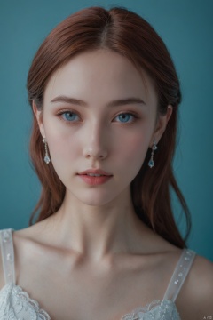 1girl, solo, looking at viewer, white dress, jewelry, earrings, blue background, red and cyan theme,