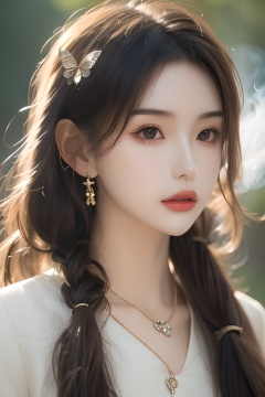 girl,Punk,Exquisite features,Beautiful and moving,Glamorous,Flowing hair,Smoke,mist surrounds the attractive figure,Tyndall ray,A sexy figure,Long,floating hair,big hair,hair strand,1girl,slender,thin,fur_coat:1.5,hair_ribbon,hair_bobbles,hair_bow,butterfly_hair_ornament,clover_hair_ornament,earrings,necklace,jewelry,crystal,tassel,arm_garter,pendant,tqj-hd,En plein air,Verism,chiaroscuro,cinematic lighting,depth of field,sparkle,reflection light,first-person view,pov,three sided view,UHD,anatomically correct,ccurate,textured skin,super detail,high details,award winning,best quality,<lora:Light_master_0.102:0.8>,<lora:松弛感_女生_松弛感_女孩:0.2>,<lora:49:1>,