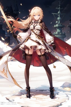 1girl, long hair, blue eyes, solo, weapon, thighhighs, blonde hair, sword, gloves, black gloves, white thighhighs, high heels, aiguillette, sheath, cape, looking at viewer, full body, holding, ribbon, holding weapon, turret, dress, holding sword, hair ribbon, long sleeves, choker, breasts, black footwear, smile, white cape, closed mouth, rigging, sheathed, bangs