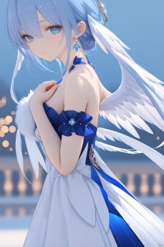 robinSR,bangs,blue eyes,dress,bow,hair between eyes,bare shoulders,jewelry,medium breasts,blue hair,earrings,wings,strapless,halo,hair intakes,head wings,strapless dress, robinSR,