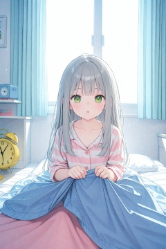 (masterpiece),(best quality),illustration,ultra detailed,hdr,Depth of field,(colorful),loli,1girl,clock,solo,alarm clock,under covers,green eyes,bed,long hair,pillow,indoors,sunlight,curtains,pajamas,grey hair,blanket,window,collarbone,bangs,