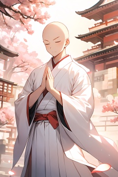 monk, bald, 1boy, solo, male focus, closed eyes, praying, facing viewer, architecture, standing, closed mouth, outdoors, wide sleeves, long sleeves, hakama skirt, palms together, flower, light, sky, petals, day, sunlight, cowboy shot, put your hands together, put your hands on your chest, highlights on the top of the head, light particle, chinese monk's white kasaya clothes, red belt, Chinese ancient architecture, Light pillar, <lora:yiling_玉面小僧:0.8>
