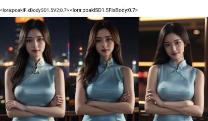 1girl,(wearing a sleeveless cheongsam:1.2),(in Shanghai city:1.2),(RAW photo, best quality),(realistic, photo-realistic:1.4),masterpiece,an extremely delicate and beautiful,extremely detailed,2k wallpaper,Amazing,finely detail,extremely detailed CG unity 8k wallpaper,ultra-detailed,highres,soft light,beautiful detailed girl,extremely detailed eyes and face,beautiful detailed nose,beautiful detailed eyes,cinematic lighting,perfect anatomy,(slim body:1.3),long hair,(black hair:1.2),city lights at night,smiling,crossed arms,((poakl)),<lora:poaklFixBodySD1.5V2:0.7>,
