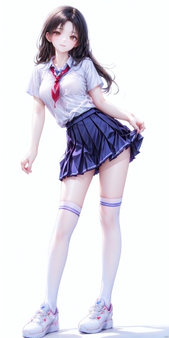 ——1girl,1girl, solo, long hair, breasts, looking at viewer, skirt, simple background, shirt, black hair, thighhighs, white background, brown eyes, school uniform, standing, full body, white shirt, short sleeves, pleated skirt, shoes, socks, blue skirt, kneehighs, white footwear, sneakers, , 1girl,Miniskirt,Skirt————Medium breast,Beautiful Legs——(Dynamic Posture: 1.5)——shuijingxie,smile——Telephoto lens————1girl, ((poakl))——, 1girl, shuijingxie<lora:EMS-254762-EMS:0.500000>, <lora:EMS-346493-EMS:0.800000>, <lora:EMS-260325-EMS:0.500000>, <lora:EMS-69165-EMS:0.400000>, <lora:EMS-93-EMS:0.800000>, <lora:EMS-27162-EMS:0.300000>