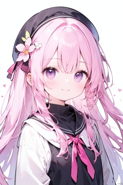 1girl, artist_name, bangs, closed_mouth, flower, gradient, gradient_background, hair_flower, hair_ornament, light_particles, long_hair, looking_at_viewer, pink_eyes, pink_hair, ribbon, sidelocks, smile, solo, upper_body, white_background, white_flower, white_headwear