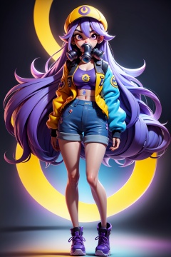 a 3D animated character with a vibrant purple hue. The character has long, wavy blue hair, large expressive eyes, and is wearing a blue jacket with a yellow graffiti design. The character also sports a yellow cap with the word 'BIG' written on it and a gas mask covering the lower half of their face, masterpiece,best quality,
