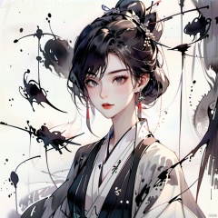 Ancient Art Style, Ink Painting, Traditional Chinese Painting, (Ink Style 1:4), (Splash Ink Painting), 1girl, solo, looking at viewer, simple background, brown hair, hair ornament, hat, brown eyes, jewelry, upper body, earrings, parted lips, grey background, lips, makeup, chinese clothes, tassel, portrait, red lips, tassel earrings (Ink style)