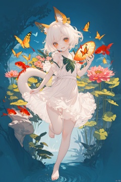best quality,masterpiece,illustration,1girl,solo,full body,Animal ear,(pond:1.2),Lotus leaf,summer,fruit,Happy expression,Happy action,(Summer wear:1.5),Butterfly,lotus,Dragon ear,(Goldfish:1.1),loli,(Simple background:1.2),Blind box,Acrylic box,fox ear,Dragon ear