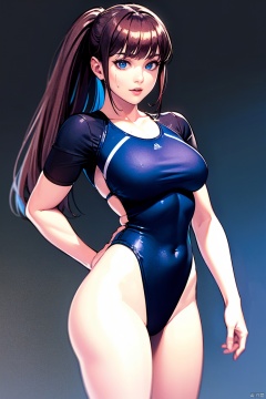 (High quality, High resolution, Fine details), Realistic,1girl,curvy women, blue eyes, (Detailed eyes:1.2),solo focus,black swimsuit,long hair,twintails,blue eyes,ponytail,bangs,long legs,looking at viewer,black thighhighssimple background,grin,Sweat,