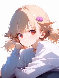 1girl, score_9, score_8_up, score_7_up, arm rest, simple background, twintails, solo, smile, upper body, jersey, head rest, blonde hair, bob cut, red eyes, light particles, :3, long sleeves, white background, hair intakes, short hair, blush, hand up, looking at viewer, closed mouth, hair flaps, hair ornament