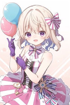 sa-fu \(sfmk39\), (best quality),(masterpiece),1girl, solo, gloves, one eye closed, purple gloves, elbow gloves, dress, bow, smile, v, ;d, open mouth, bare shoulders, hair between eyes, looking at viewer, balloon, ferris wheel, striped bow, small breasts, striped