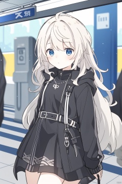 sa-fu \(sfmk39\),An 18-year-old girl,Short white hair,No clothes , Black Cloak,Blue Eyes,Subway station,No expression,Hiss, texas_the_omertosa_(arknights), solo,(masterpiece),