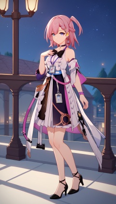 absurdres, best quality, uncensored, score_9, score_8_up, score_7_up, outdoors, night sky, starry sky, solo, 1girl, asta \(honkai: star rail\), hairclip, one side up, pink hair, braid, blue eyes, black bowtie, white shirt, black skirt, bare shoulders, detached sleeves, id card, center frills, lanyard, choker, hand on own chest,high heels, looking at viewer, standing, full body, <lora:asta-000004:0.8>,