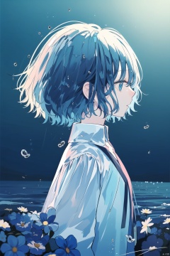 hagimorijia, blue eyes, blue hair, blue theme, blurry, commentary, depth of field, flower, from side, highres, original, parted lips, profile, short hair, signature, solo, symbol-only commentary, upper body, water drop