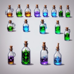 Array of magical world style potion bottles in pixel art, Each item is an independent pixelated entity with high-tech magic stoppers, Arranged in 2D pixel game prop style, No overlapping, Solid gray-black background for easy clipping, High quality, Detailed, Pixelated, Each potion bottle features a unique pixel design with Western fantasy aesthetics