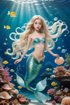 5 year old girl,mermaid,long hair,monster girl,shell,underwater,navel,solo,sunlight,light rays,coral,starfish,blonde hair,bare shoulders,red lips,looking at viewer,floating hair,seashell,sunbeam,air bubble,full body,bubble,flower,shell bikini,collarbone,parted lips,watermark,blue eyes,lips,pearl (gemstone),scales,very long hair,water,rock,stomach,gem,makeup,fish,small breasts,strapless,<lora:MEIRENYU_20240421220339:0.8>,