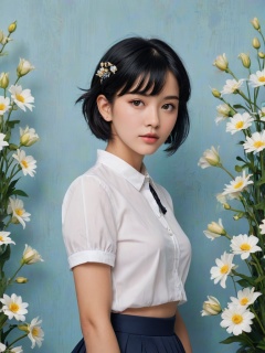 (masterpiece: 1.2), Magazine cover, A girl, Short black hair, Flowers, Flower hairpins, White short-sleeved shirt, Blue-black pleated skirt, masterpiece, The best quality, Wallpaper, Poster, 32k, Background of Flower Sea, fashion, sexy, HD, anatomically correct, best quality, 16k,YUNY