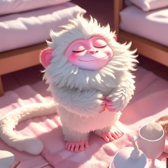 shenhou,monkey,fluffy,sunlight,light particles,whiskers,cute,cc-color-correction,mf-movie-filter,warm colors,whimsy and dramatic lighting,white fur,soft lighting,monkey focus,no humans,closed eyes,blurry,closed mouth,indoors,sleeping,smile,sitting,full body,pillow,cup,<lora:shenhou_v1:0.8>,