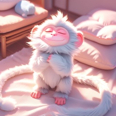 shenhou,monkey,fluffy,sunlight,light particles,whiskers,cute,cc-color-correction,mf-movie-filter,warm colors,whimsy and dramatic lighting,white fur,soft lighting,monkey focus,no humans,closed eyes,blurry,closed mouth,indoors,sleeping,smile,sitting,full body,pillow,cup,,<lora:shenhou_xl:0.8>,