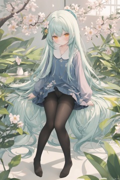 chen_bin,1girl,mint hair,orange eyes,clover hair ornament,long hair,disheveled hair,messy hair,plum blossoms,blue pajamas,branch,dragonfly,full body,mismatched legwear, white legwear, black legwear,pantyhose, xinniang, backlight, black pantyhose,