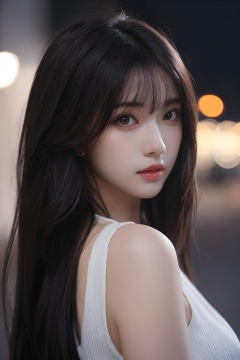 1girl,night,upper body,looking at viewer,long hair,hair,Depth of field,blurred background,outdoors,solo,huge filesize,simple_background,eyes_focus,close-up,front view,