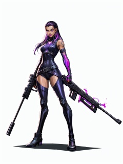 HEZI,Valenlott style,European and American cartoon character design,cutting,dividing,angular,features,1girl,weapon,gun,solo,holding,dark skin,holding weapon,holding gun,long hair,rifle,purple hair,dark-skinned female,earrings,bodysuit,white background,fingerless gloves,gloves,multicolored hair,breasts,purple eyes,glowing,looking at viewer,jewelry,medium breasts,black gloves,hair slicked back,animification,standing,full body,black bodysuit,assault rifle,boots,black hair,hair behind ear,simple background,thighhighs,tattoo,makeup,belt,glowing eyes,parted lips,open hand,arm tattoo,gradient hair,elbow gloves,submachine gun,black footwear,smile,bare shoulders,trigger discipline,fingernails,jacket,piercing,pink eyes,closed mouth,purple lips,lipstick,shadow,knee boots,pink hair,two-tone hair,bangs,sniper rifle,shoulder tattoo,hoop earrings,purple bodysuit,armor,<lora:欧美卡通人物设计V2版本-000012:0.7>,