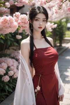 red hanfu,1girl,(spring,flowers:1.2),looking_at_viewer,,(big breasts:1.29),red dress